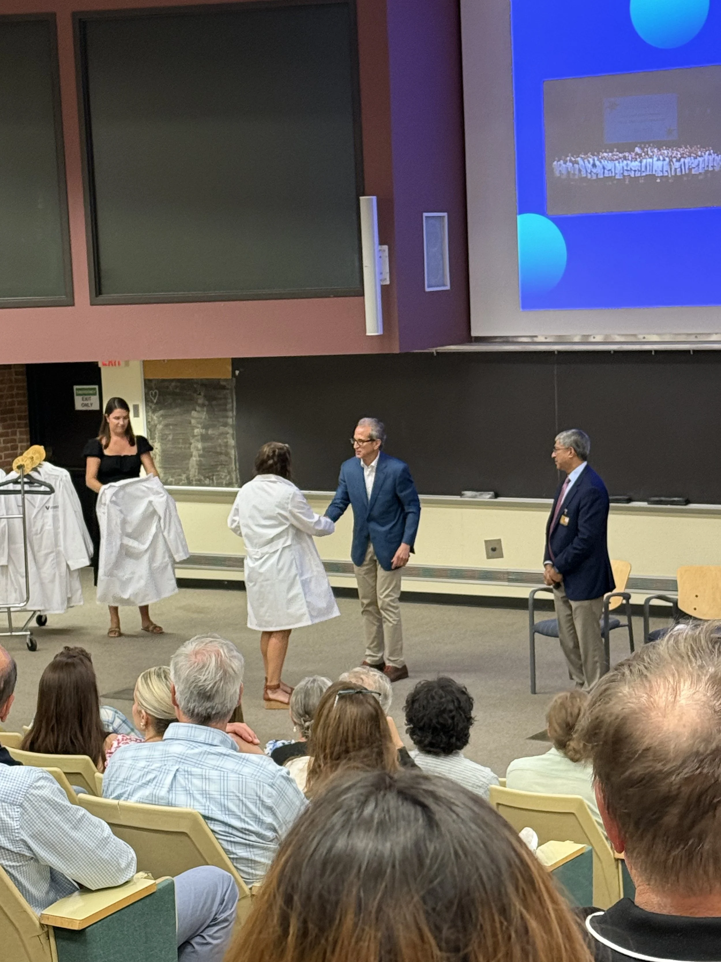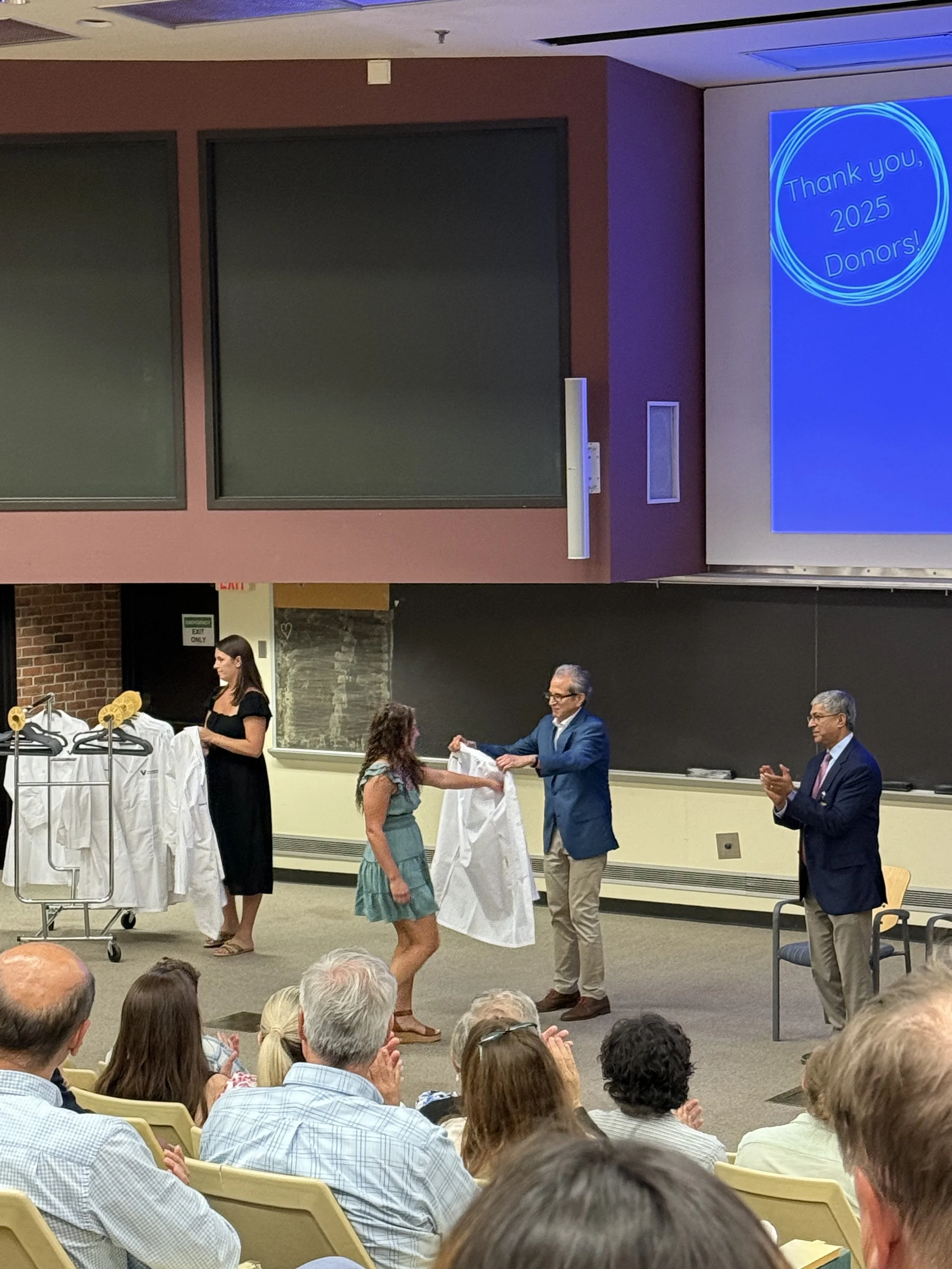 Kaylee dons her lab coat after listening to a couple of inspiring speeches